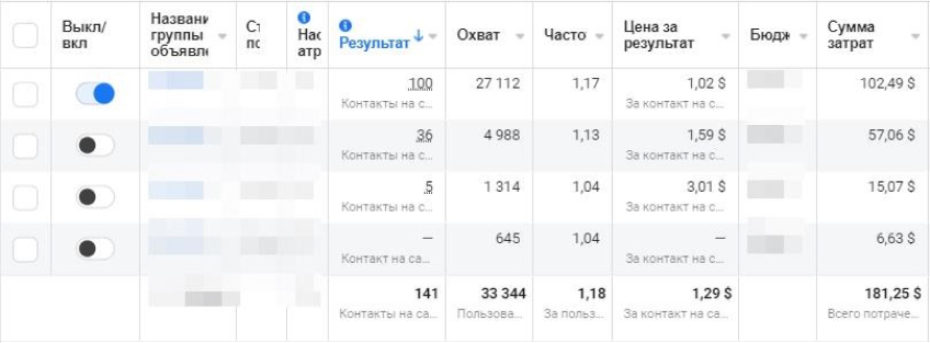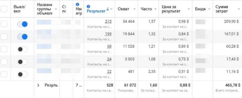 Screenshots of advertising campaigns with conversion results: